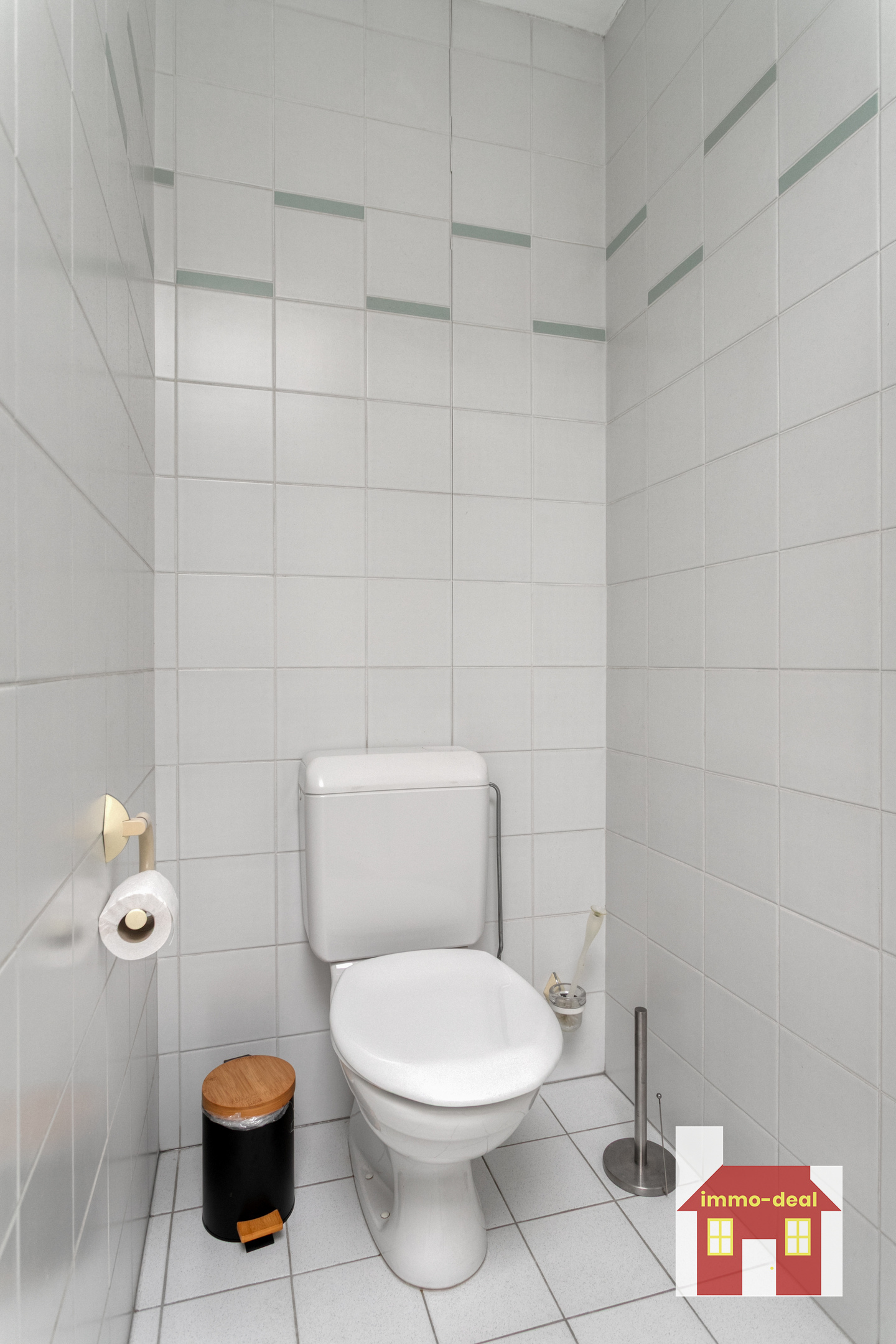 Gelijkvloers: – ruime inkomhal – apart toilet – lichtrijke leefruimte met open, ingerichte keuken + frontaal zicht op de zijtuin – ingerichte badkamer (ligbad, douche & badkamermeubel) – slaapkamer – grote wasruimte + garage/bergruimte