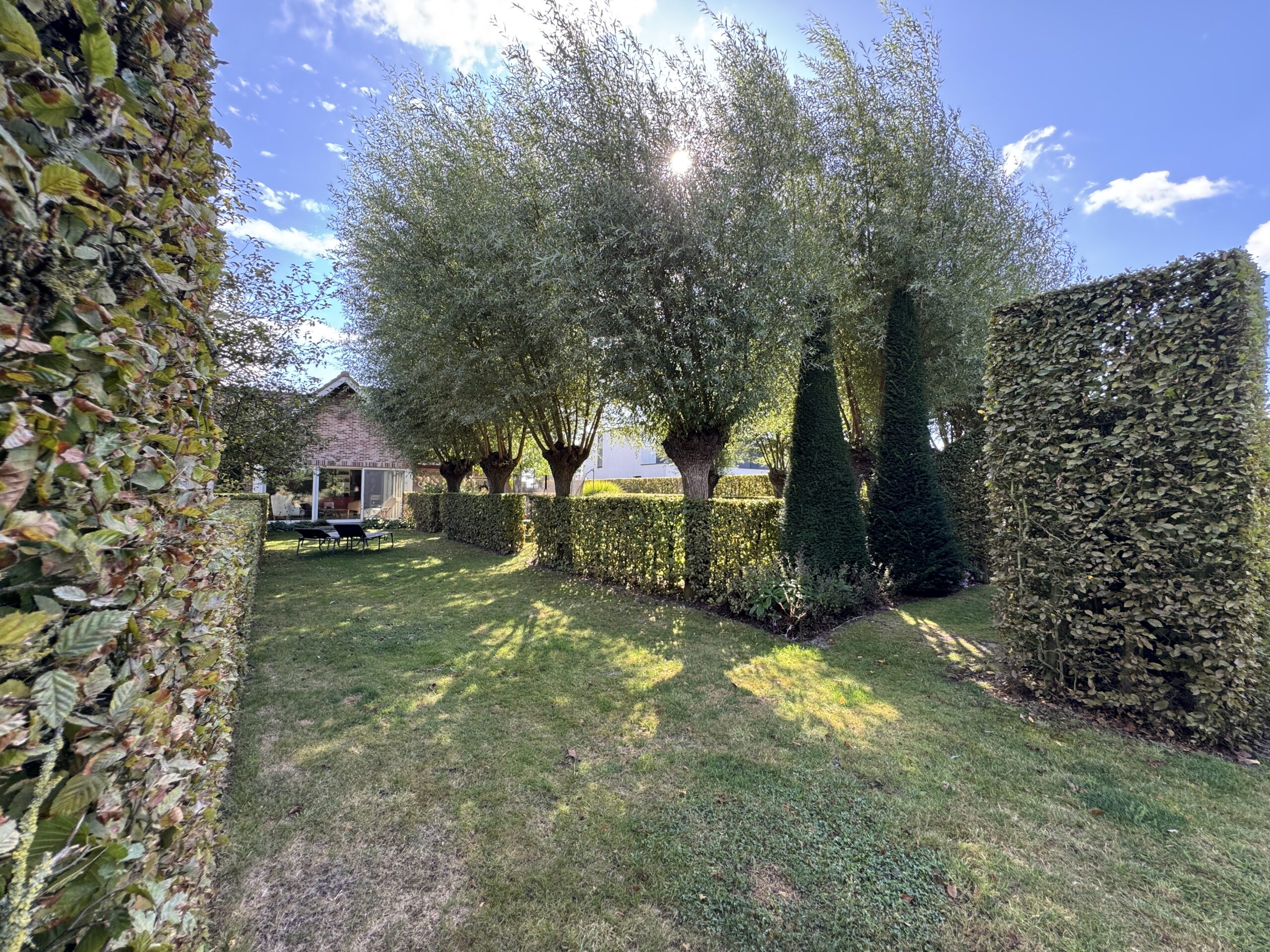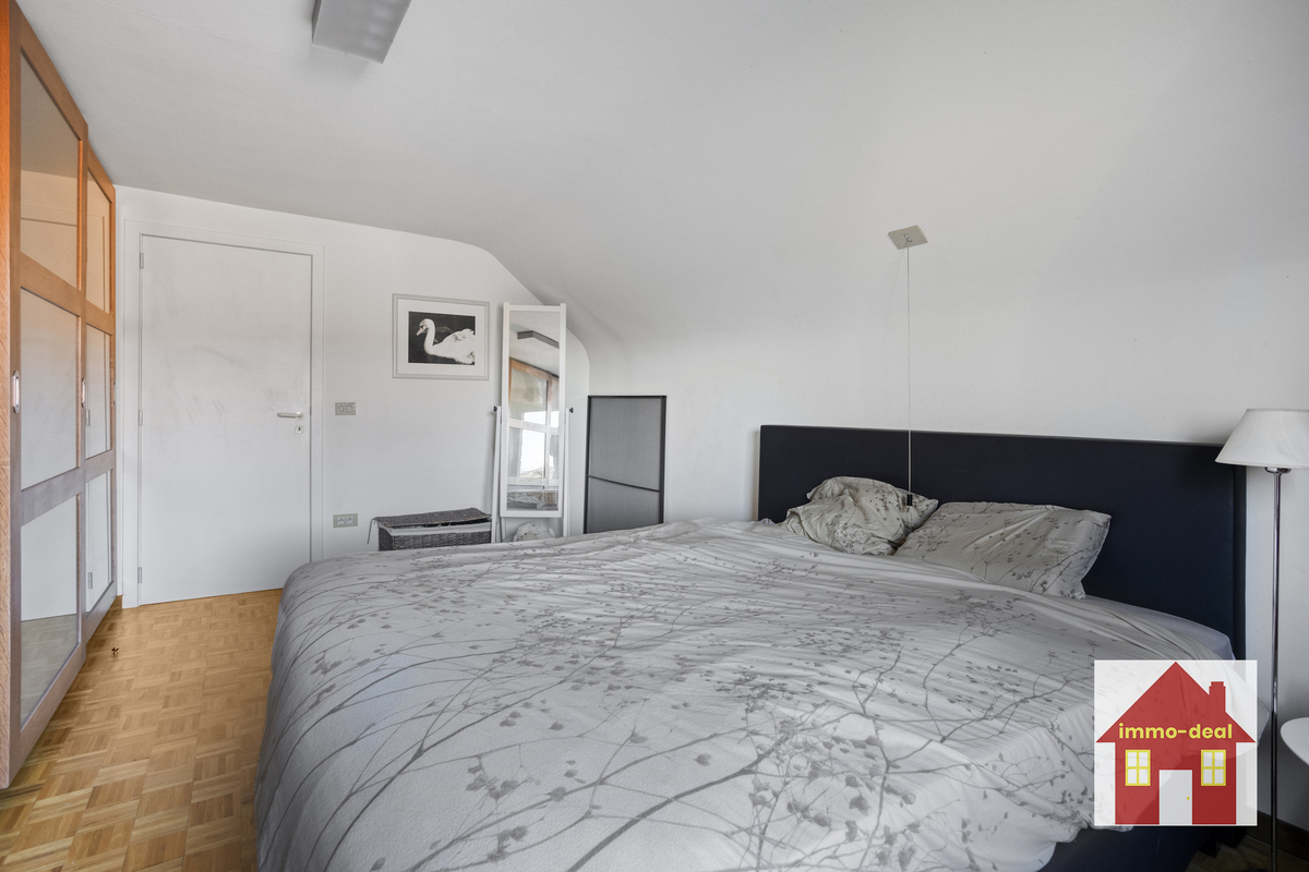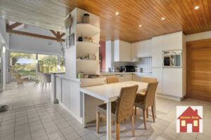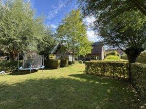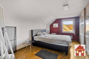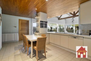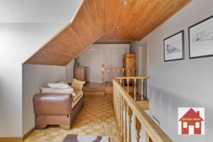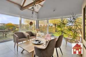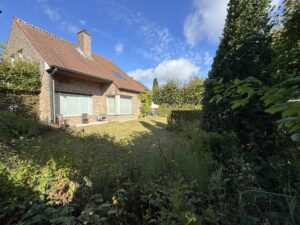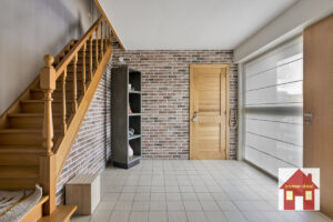 Gelijkvloers: – ruime inkomhal – extra slaapkamer/bureau-ruimte – apart toilet – lichtrijke leefruimte met zicht op de tuin – ingerichte keuken met eetplaats en prachtige, ruime zit/leefruimte met volledig zicht op het groen – garage (plaats voor 2 auto’s) + wasruimte – doucheruimte