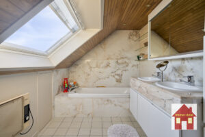 Eerste verdiep: – nachthal – 4 slaapkamers – bergruimtes – badkamer met toilet, badkamermeubel + ligbad